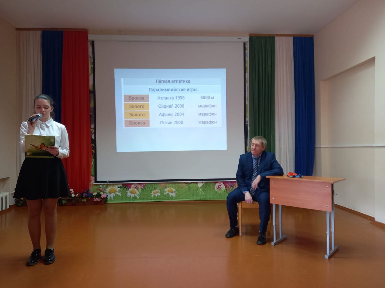 Всероссийский урок "О, спорт, ты - мир!" в поддержку спортсменов - паралимпийцев Российской Федерации в нашей школе прошёл с приглашением Ильдара Валерьевича Помыкалова. Это российский легкоатлет. Двукратный чемпион и двукратный бронзовый призёр Паралимпийских игр. Заслуженный мастер спорта России.