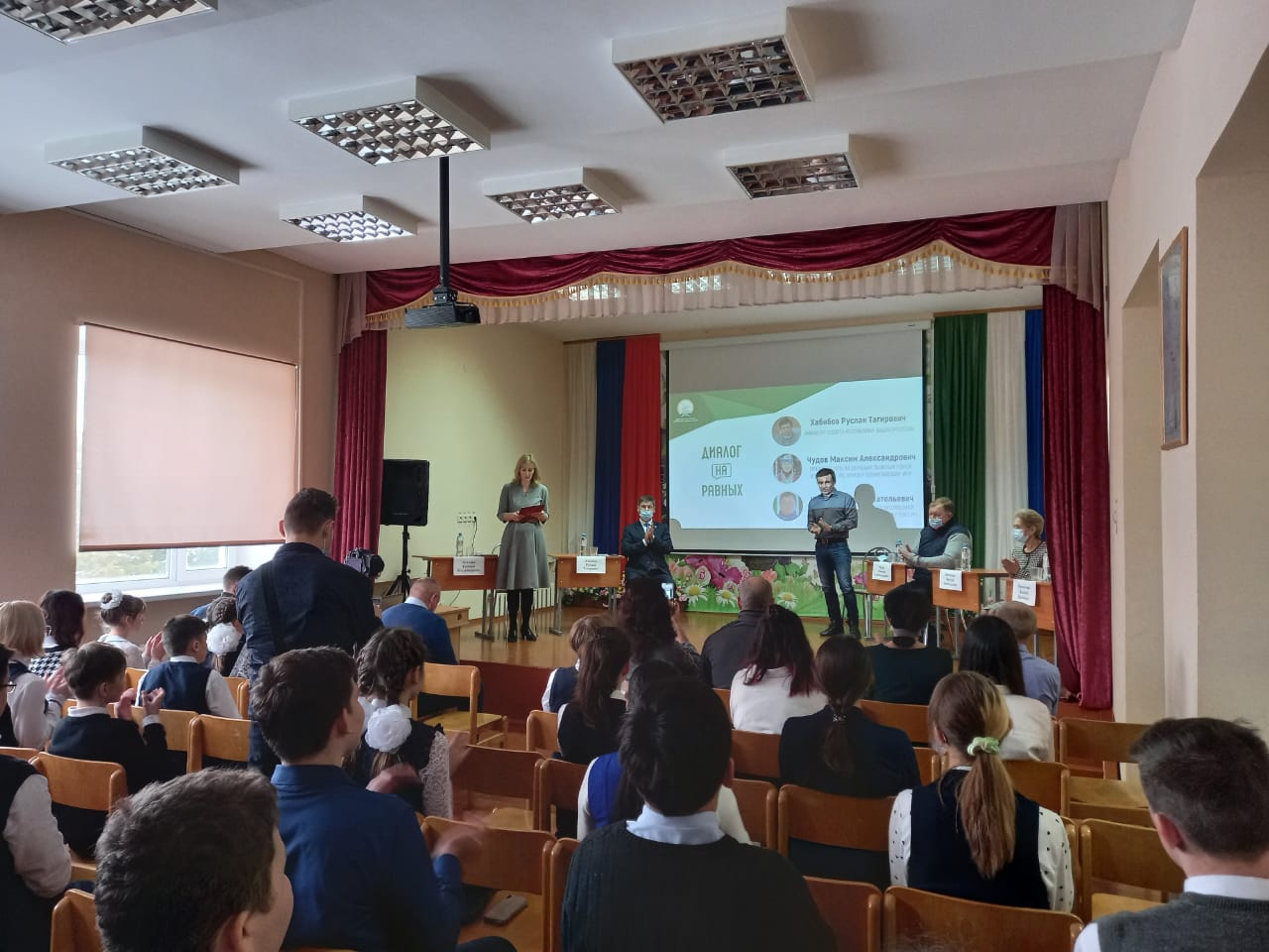 После рабочей встречи администрация школы пригласила гостей в актовый зал на мероприятие, где их встречали аплодисментами педагоги и обучающиеся школы. Формат встречи проходил по проекту "Диалог на равных". Данный проект нацелен на демонстрацию молодёжи на примере успешных и известных людей, что современная Россия - это страна возможностей, где каждый может добиться успеха в любой сфере деятельности вне зависимости от места рождения и социальной статуса. Диалог проводился в формате вопрос-ответ. Ребята задавали самые разные вопросы к каждому присутствующему гостю. Впечатления, полученные от сегодняшней встречи, наполнены радостью, трепетом, надеждой на лучшее.