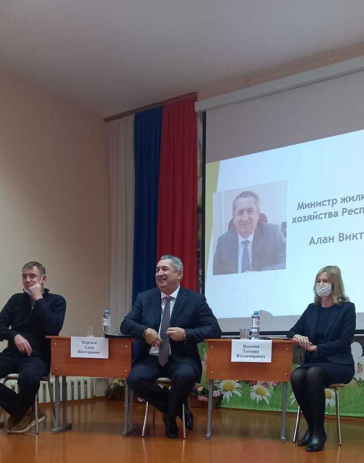 Сначала учащиеся показали гостю небольшой концерт, а затем началось живое общение министра с педагогами и детьми. Алан Викторович поделился с ребятами о своём жизненном пути, с теплом и тоской вспоминал горы своей родины - Северной Осетии, где он вырос и по которым скучал во время работы в Подмосковье и Москве, но когда Алан Викторович переехал работать в Башкортостан, то, по его словам, влюбился в этой чудесный край и горы, которых ему так не хватало. Затем разговор перешёл на насущные проблемы и дела, которые министр мог бы посодействовать разрешить.
